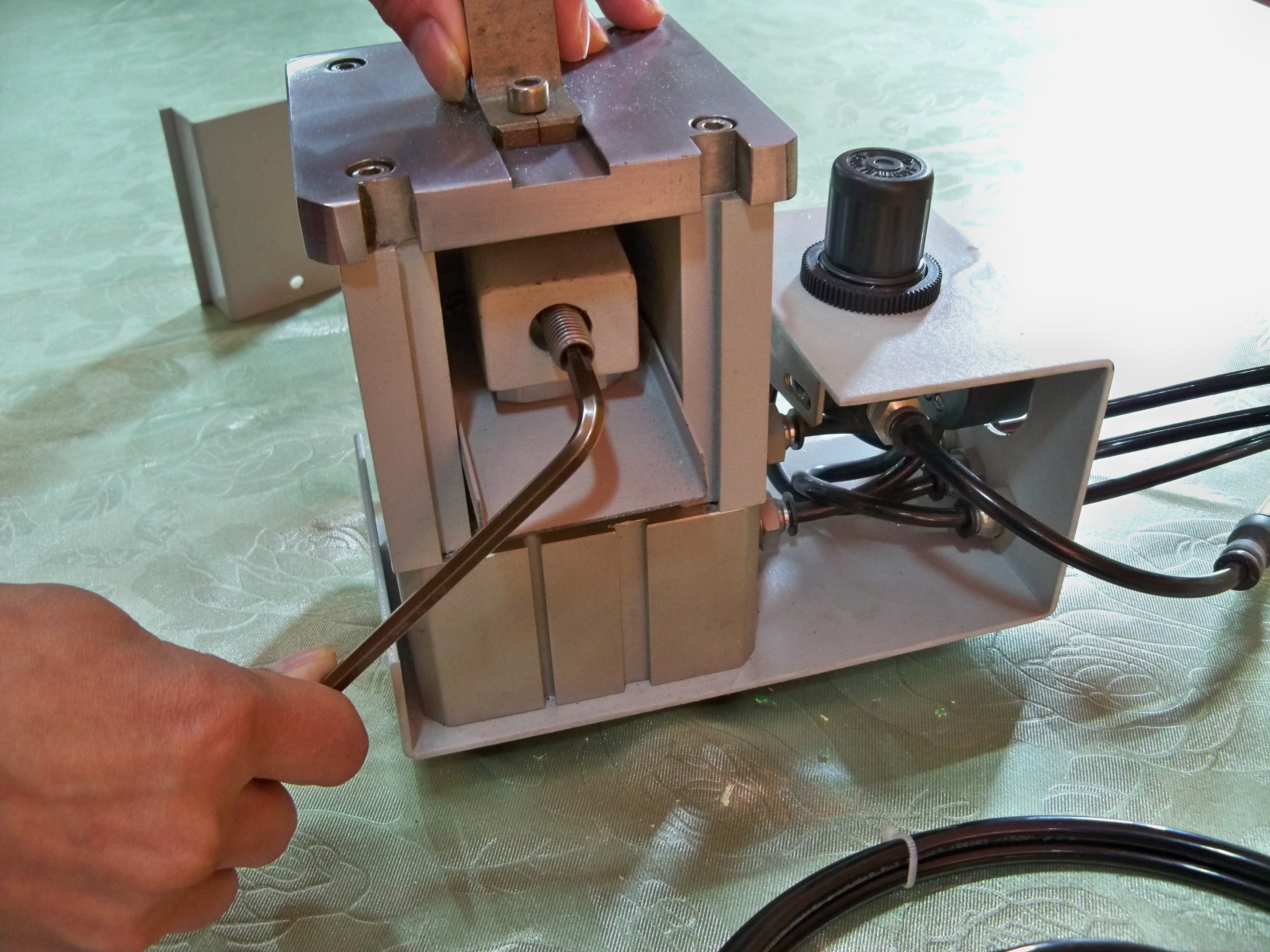The PCB is slipped with its milled groove over the blade and is placed onto the matrix. The off-cut is pulled under the blade. When the foot switch is pressed, the off-cut is punched out and the waste material is collected inside the machine.